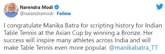 मनिका के इस जीत पर पूरा देश उन्हें बधाई दे रहा है। प्रधानमंत्री नरेंद्र मोदी ने बधाई देते हुए ट्वीट किया “मैं मनिका बत्रा को एशियन कप में कांस्य जीतकर भारतीय टेबल टेनिस में इतिहास रचने के लिए बधाई देता हूं। उनकी सफलता पूरे भारत में कई एथलीटों को प्रेरित करेगी और टेबल टेनिस को और भी लोकप्रिय बनाएगी। @manikabatra_TT”