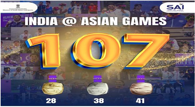 भारत ने हांग्जो एशियाई गेम में अपना अभियान सर्वश्रेष्ठ प्रदर्शन के साथ समाप्त किया। मेडल टैली में देश ने चौथे स्थान पर रहा है। जो 1962 के जकार्ता एशियाड के बाद से यह भारत का अब तक का सर्वश्रेष्ठ स्थान है। भारत ने कुल 107 पदक जीते। जिसमें 28 गोल्ड, 38 सिल्वर और 41 ब्रॉन्ज़ मैडल है।