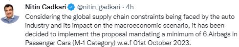 श्री गडकरी ने कहा कि ऑटो उद्योग के सामने मौजूद वैश्विक आपूर्ति श्रृंखला संकट और माइक्रो इकोनॉमिक परिदृश्य को ध्यान में रखते हुए तय किया गया है कि सभी यात्री कारों (एम-1 श्रेणी) में कम से कम 6 एयरबैग अनिवार्य करने का प्रस्ताव 01 अक्तूबर 2023 से लागू किया जाएगा।