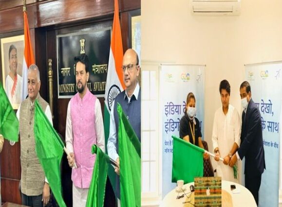 New Delhi: केन्द्रीय सूचना और प्रसारण मंत्री अनुराग ठाकुर, केन्द्रीय नागर विमानन मंत्री ज्योतिरादित्य सिंधिया और केन्द्रीय नागर विमानन राज्यमंत्री जनरल वी.के. सिंह ने रविवार को इंडिगो एयरलाइन की दिल्ली-धर्मशाला-दिल्ली की पहली उड़ान को झंडी दिखाई।