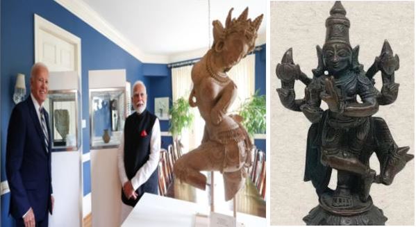 प्रधानमंत्री मोदी की अमरीका की यात्रा के अवसर पर अमरीकी पक्ष ने भारत से चोरी की गयी अथवा तस्करी के माध्यम से ले जायी गयी 297 प्राचीन वस्तुओं की वापसी में सहायता की है। इन्हें शीघ्र ही भारत को वापस लौटा दिया जाएगा। डेलावेयर के विलमिंगटन में द्विपक्षीय बैठक के दौरान प्रधानमंत्री मोदी और राष्ट्रपति बाइडेन को प्रतीकात्मक रूप से कुछ चुनिंदा वस्तुएं सौंपी गईं। प्रधानमंत्री ने इन कलाकृतियों की वापसी में सहयोग के लिए राष्ट्रपति बाइडेन को धन्यवाद दिया। उन्होंने कहा कि ये पुरावशेष न केवल भारत की ऐतिहासिक भौतिक संस्कृति का हिस्सा थे, बल्कि भारतीय सभ्यता एवं चेतना का आंतरिक आधार भी थे।